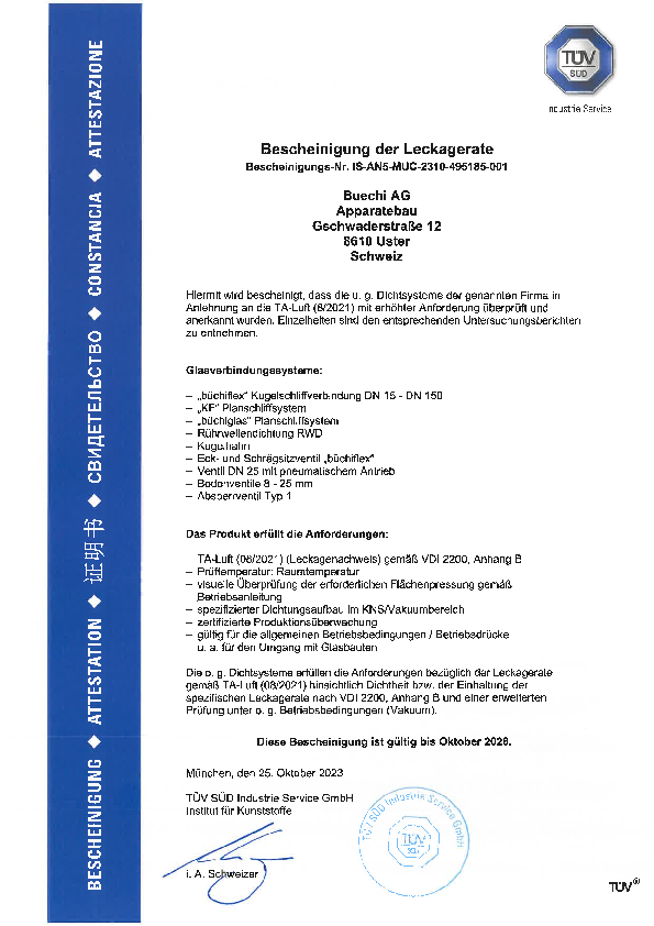 I reattori a pressione, i reattori in vetro e le apparecchiature di processo Buchi soddisfano i più elevati requisiti normativi e operativi. Le nostre soluzioni sono conformi a tutte le normative obbligatorie e alle linee guida tecnologiche. La nostra documentazione, ampia e all'avanguardia, costituisce la base per un'efficiente qualificazione cGMP delle vostre apparecchiature. Questo assicura a voi, clienti, una qualità affidabile dei prodotti e dei processi e un miglioramento continuo dei nostri servizi.